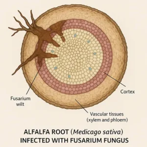 بیماری فوزاریوم با ایجاد بافتهای مرده، آوندهای قهوهای و ضعف عمومی گیاه، ساختار بافتی یونجه را تغییر میدهد و سبب سفت شدن ساقهها و کاهش قابلیت هضم توسط دام میشود.
