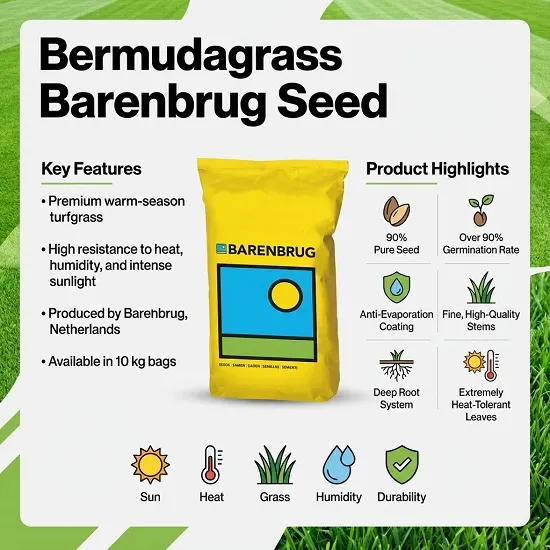 بذر چمن برموداگراس بارنبروگ (Bermudagrass Barenbrug) که به بذر چمن آفریقایی نیز شهرت دارد، یکی از با کیفیت ترین بذور چمن مقاوم به گرما، رطوبت و شرجی هوا و آفتاب شدید است. این بذر ، محصولی با کیفیت از کمپانی معروف بارنبروگ هلند است که در پاکت های ۱۰ کیلوگرمی بسته بندی و به بازار عرضه شده است .