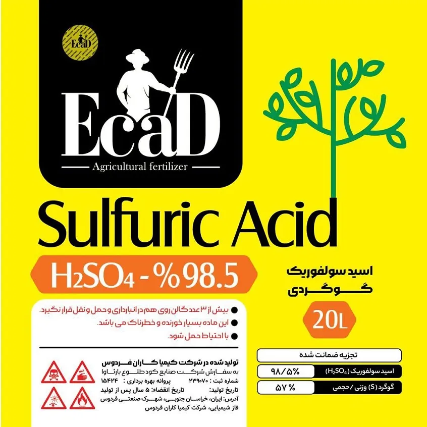 اسید سولفوریک 98.5٪ ایکاد یکی از محصولات پیشرفته و تخصصی در حوزه کودهای مایع کشاورزی است که نقش مهمی در اصلاح خاک و تأمین گوگرد ایفا میکند. این محصول با فرمول شیمیایی H₂SO₄ و خلوص فوقالعاده (98.5 درصد) تولید شده و علاوه بر خاصیت اسیدی، حدود 57 درصد گوگرد وزنی در خود دارد که منبعی غنی برای تغذیه گیاهان محسوب میشود. شرکت EcaD با بهرهگیری از تکنولوژی تولید دقیق، این اسید را در بستهبندی 20 لیتری عرضه میکند تا به راحتی توسط کشاورزان در زمینهای زراعی و باغی استفاده شود.